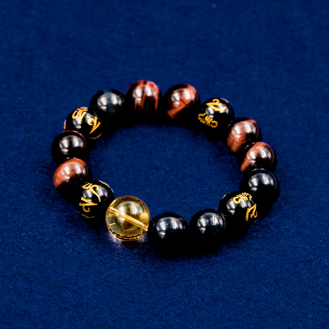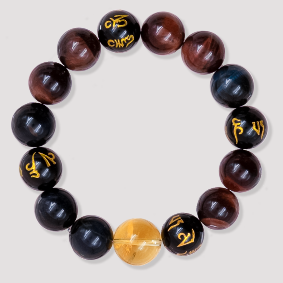 He breaks through with fire, stands firm in clarity, and walks with sacred intention. Fierce Dharma is crafted for those who seek transformation, energetic protection, and spiritual alignment. Red Tiger Eye ignites courage and resilience, empowering you to move forward with strength. Obsidian absorbs negativity and purifies your energetic field, clearing the path ahead. Six-Syllable Mantra Black Agate calms the mind and strengthens mindfulness, balancing the intensity with sacred stillness. Golden Citrine amplifies your aura and attracts abundance, adding radiant confidence to the mix. Together, they form a powerful cycle—action, purification, intention, and prosperity. Wear it as a reminder: your fire is sacred, your clarity is protection, and your path is blessed.