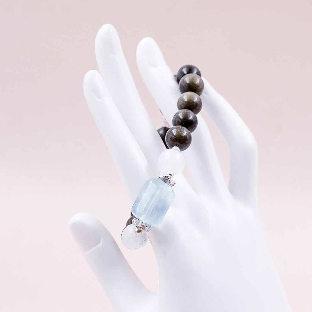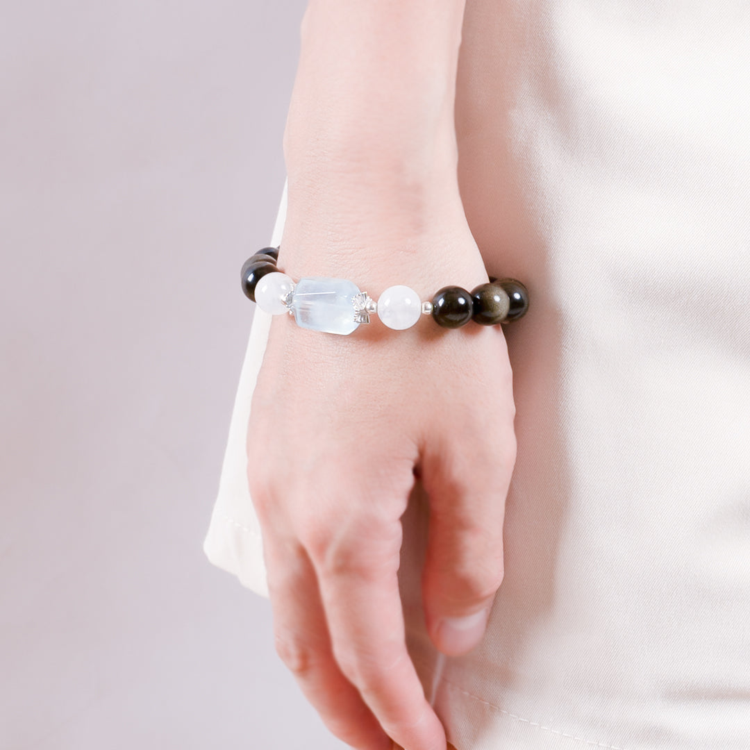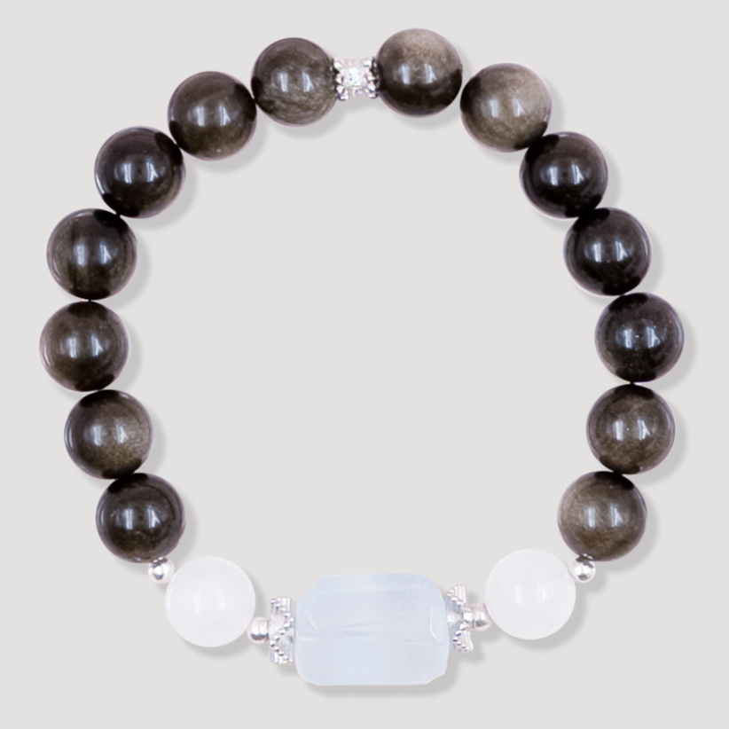 She is soft like moonlight, clear like water, and strong like silver. Moonveil Clarity is crafted for women who feel deeply, live gracefully, and grow boldly. Silver Obsidian purifies your energetic field and eases inner tension. Moonstone nurtures the soul, enhancing intuition and emotional awareness. Aquamarine adds gentle courage and clarity, grounding the softness with strength. Together, they form a sacred trio—cleansing, nourishing, and empowering. Wear it as a reminder: your clarity is your compass, your softness is your shield, and your courage is your light.