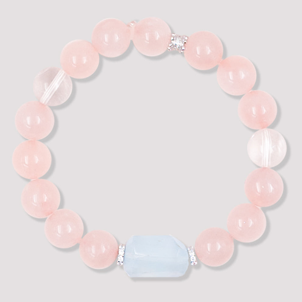 This bracelet blends the cleansing clarity of Clear Quartz, the serene vision of Aquamarine, and the warm glow of Rose Quartz.