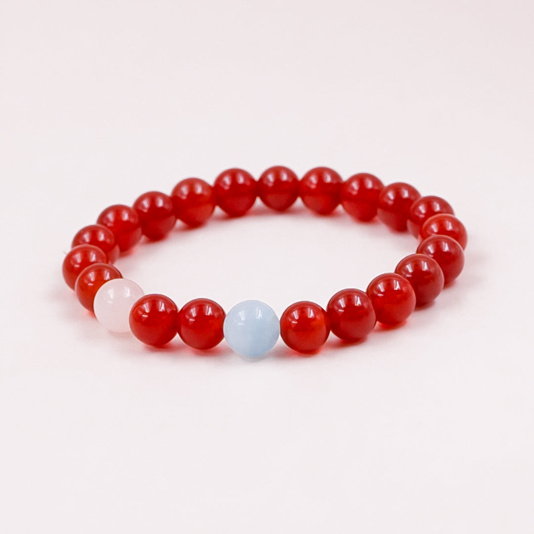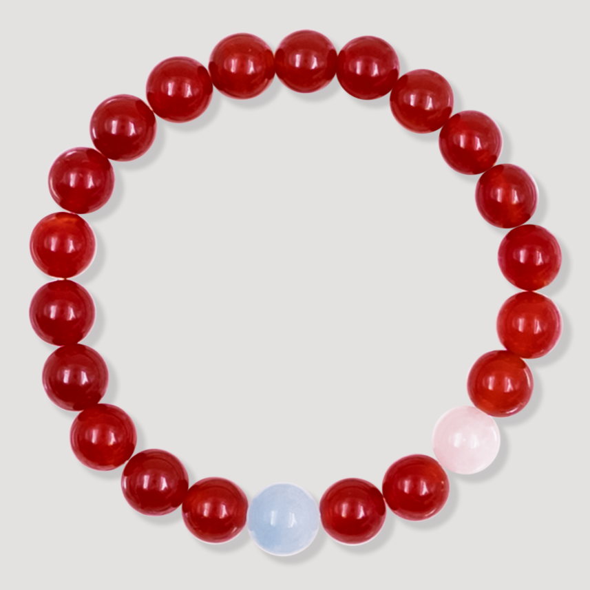 你的心,就是你的力量——柔軟、閃耀、且堅韌。 赤韵雙柔為渴望活力與情感平衡的女性而設。 紅瑪瑙激發熱情,強化內在韌性;摩根石滋養心輪——粉色調促進連結與同理,藍色調則舒緩焦慮、平復心緒。 兩者融合,形成一種平衡能量:既果敢又溫柔,既充滿活力又寧靜安然。 佩戴它,提醒自己:你的溫暖是力量,你的柔軟是守護。